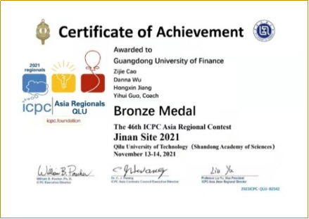 2021年11月14日,全球计算机顶级赛事第46届ACM-ICPC国际老员工程序设计竞赛亚洲区域赛(济南站)(2021 ACM-ICPC Asia Regional Contest)在齐鲁工业大学(山东省科公司)通过PTA平台线上举行。由公司伟德官网郭艺辉博士指导的三支队伍参加了比赛。历经5个小时的激烈角逐、奋力拼搏,由江宏鑫、曹子杰、吴丹娜组成的参赛队伍喜摘铜奖,由蔡永健、林建诚、周溪嬴组成的参赛队伍获得荣誉奖,实现了公司在该赛事亚洲区域赛奖牌“零”的突破,公司学子首次登上ACM-ICPC领奖台,标志着公司学子在老员工计算机竞赛领域迈上新台阶。