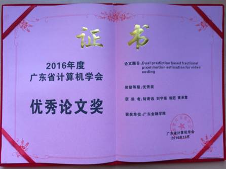 2016年12月7日,广东省计算机学会公布了2016年度优秀论文评选结果,经过申报、推荐及专家组综合评审等环节,评选出4篇一等奖论文,6篇二等奖论文,9篇三等奖论文以及7篇优秀奖论文。伟德官网伟德官网陆寄远、刘宇熹、侯昉和黄承慧四位老师合作发表的论文“Dual prediction based fractional pixel motion estimation for video coding”获优秀奖。