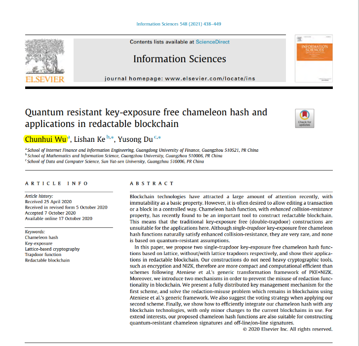 伍春晖老师的论文提出了两种基于格的单陷门无密钥泄露的变色龙哈希函数,比Ateniese等人的通用构造更紧凑且计算效率更高,然后展示了它们在可编辑区块链中的应用。论文同时提出了分布式密钥管理机制和投票机制,以防止编辑功能的滥用。该成果发表在中科院一区Top期刊《Information Sciences》(vol. 548, pp. 438-449, 2021)上。