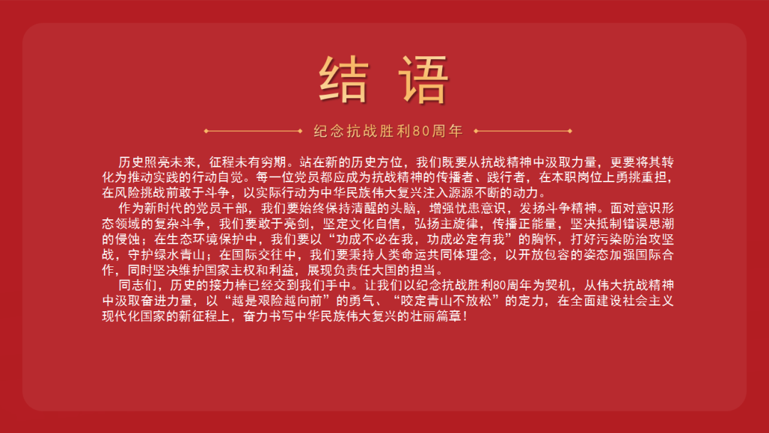 党课结合当前形势与高校教师的使命担当,对全体党员提出要求:一要铭记历史,传承精神。要深刻理解抗战胜利的伟大意义和抗战精神的时代价值,将其融入立德树人全过程,引导青年员工增强爱国情怀和民族自豪感。二要立足本职,奋发有为。要将学习弘扬抗战精神转化为推动公司团队建设、科学研究、人才培养等各项事业发展的实际行动,勇于攻克科研难关,潜心教书育人。三要坚守初心,担当使命。要赓续红色血脉,牢记为党育人、为国育才的初心使命,在新时代新征程上展现高校教师党员的新作为,为教育强国、科技强国建设贡献智慧和力量。