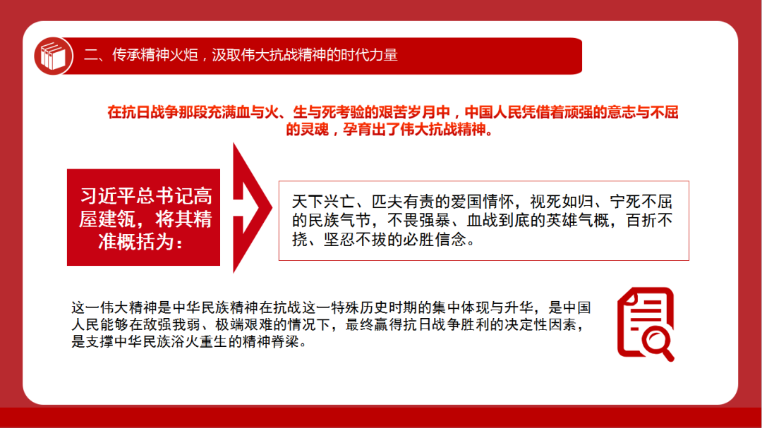 刘宇熹书记强调,在波澜壮阔的抗战进程中,孕育出的伟大抗战精神——天下兴亡、匹夫有责的爱国情怀,视死如归、宁死不屈的民族气节,不畏强暴、血战到底的英雄气概,百折不挠、坚韧不拔的必胜信念,是中国人民弥足珍贵的精神财富,永远是激励我们克服一切艰难险阻、为实现中华民族伟大复兴而奋斗的强大精神动力。
