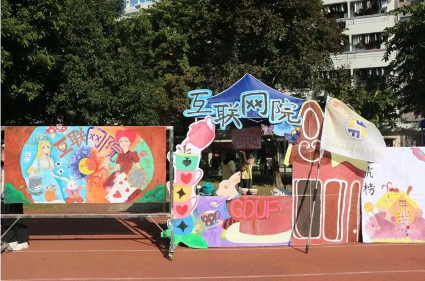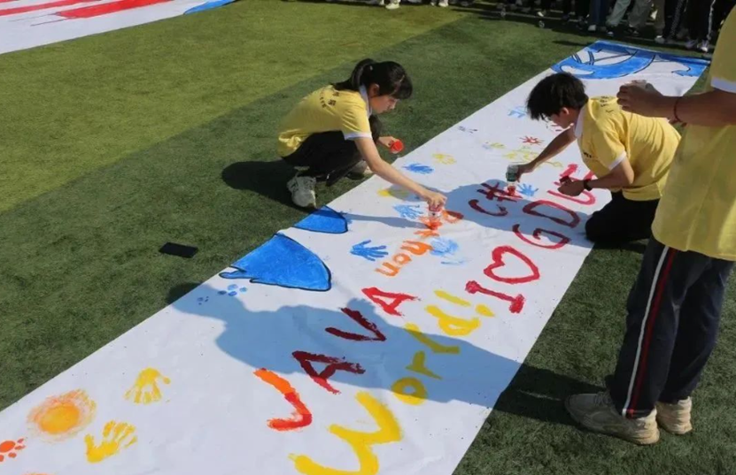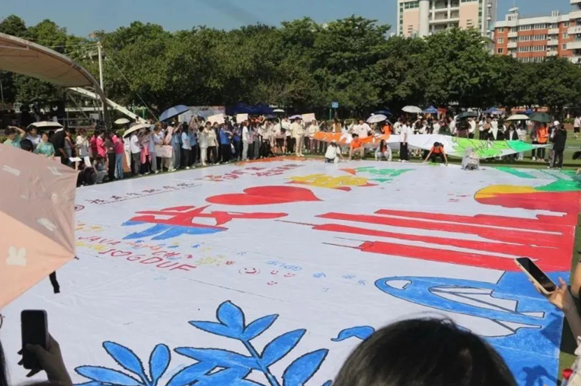 运动会最后一个项目是由各院员工完成一幅幅巨画条幅,将其拼合在一起,共绘“我爱广金”的大蓝图。